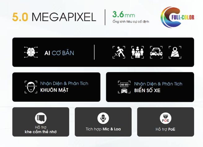 · Phát hiện tụ tập đông người, hàng chờ tắc nghẽn · Cảnh báo khu vực xâm nhập, hàng rào ảo · Cảnh báo tiếng ồn như: tiếng súng, em bé khóc |